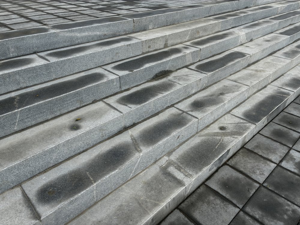 Большая часть поверхности — та, что не занята газоном и деревьями — покрыта тротуарной плиткой. Ступени нескольких лестниц — керамогранитом. А бортики вокруг газонов и вдоль лестниц облицованы плиткой под мрамор. В целом все выглядит не очень ярко — цвет серо-коричневатый — но приятно.