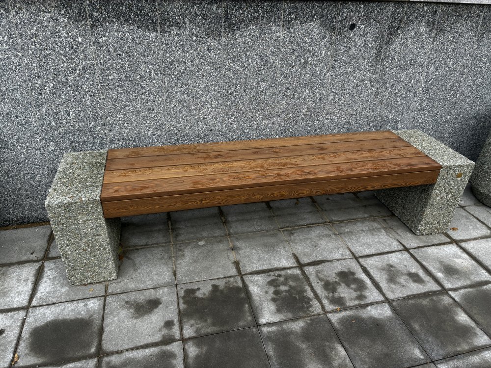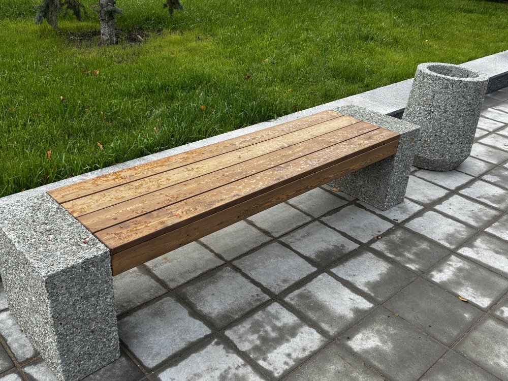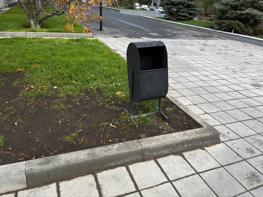 Старые, советские еще, лавочки с площади убрали, их заменили современными. Смотрятся они, безусловно, гораздо лучше. В комплект с лавочками идут и урны — массивные, будто бы вырубленные из камня. И на том, и на другом — одинаковые золотистые шильдики. Впрочем, перед самой администрацией сохранились древние урны: очень старые, тысячу раз перекрашенные.