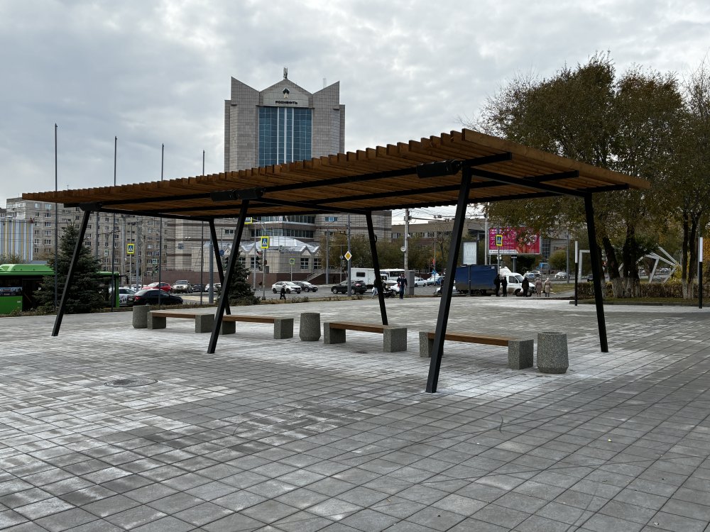 Между зданием администрации и тротуаром вдоль Чкалова установлены две крупные деревянные конструкции. Это перголы, вошедшие в Оренбуржье в моду с легкой руки экс-министра архитектуры Натальи Ибрагимовой. Считается, что это хороший инструмент организации пространства: создает не очень густую тень, при этом продувается насквозь, спасая от жары.