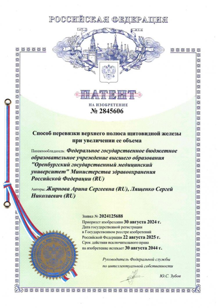 Учёные Оренбургского государственного медицинского университета разработали новый способ лечения проблем с щитовидкой: перевязку верхнего полюса железы при увеличении её объёма. Авторами научной работы стали доцент кафедры общей хирургии, кандидат медицинских наук А.С. Жирнова и заведующий кафедрой оперативной хирургии и клинической анатомии имени С.С. Михайлова, профессор, доктор медицинских наук С. Н. Лященко.