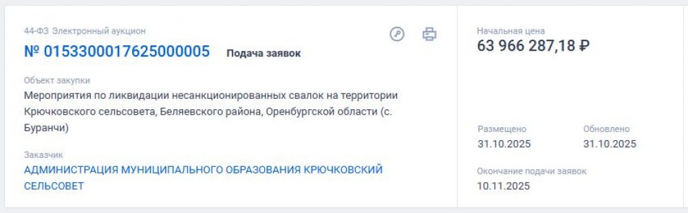 На портале госзакупок опубликовано извещение: администрация Крючковского сельсовета ищет подрядчика, который ликвидирует несанкционированную свалку возле села Буранчи (относится к Беляевскому району, в 80 километрах от Оренбурга). За работу муниципалитет готов заплатить почти 64 миллиона рублей.