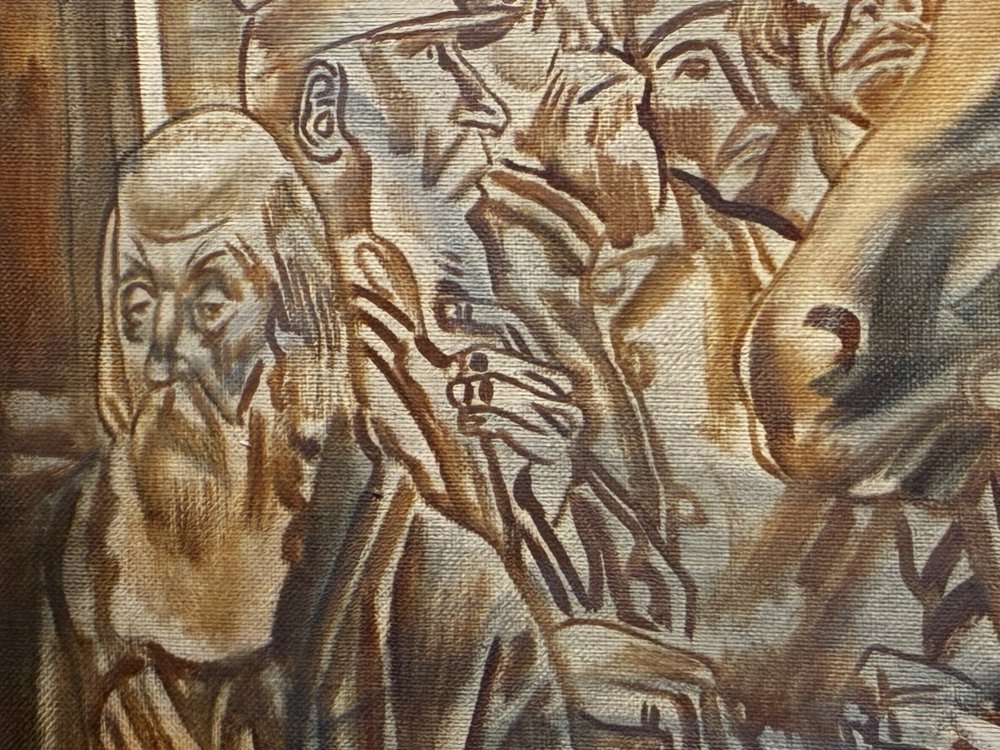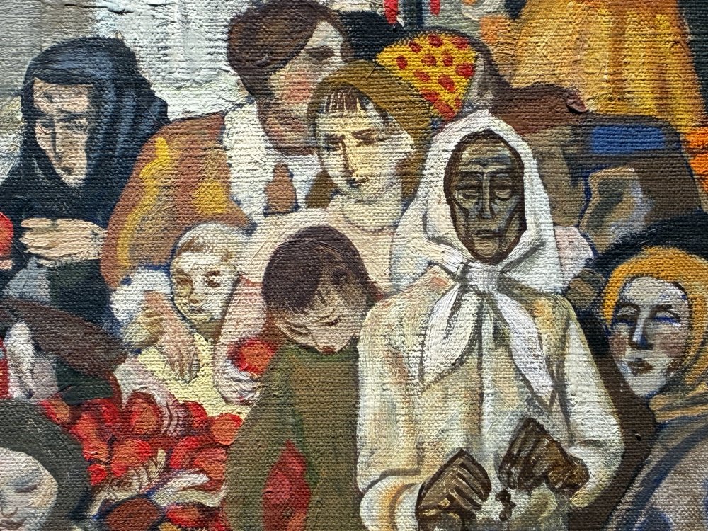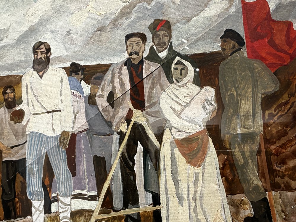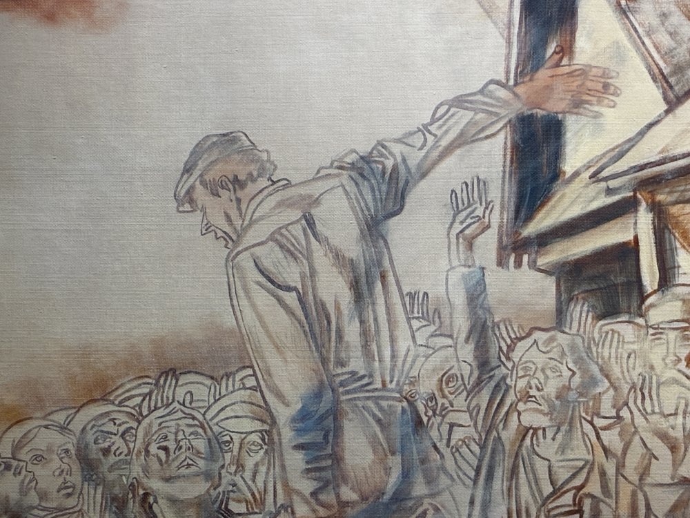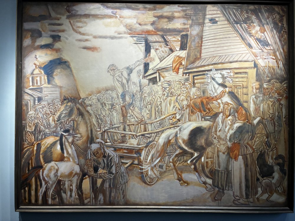 Центральное место на выставке занимает «картина, которой нет». Это огромный, метр восемьдесят на два с половиной, холст: «Митинг в деревне». Сюжет классический: годы Гражданской войны, в село входят красноармейцы, крестьяне слушают коммуниста-агитатора, но кое-то явно замышляет недоброе: кулак, купчина, злобная старуха…