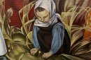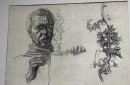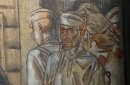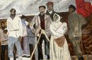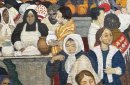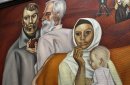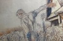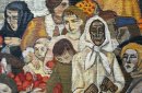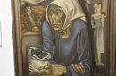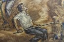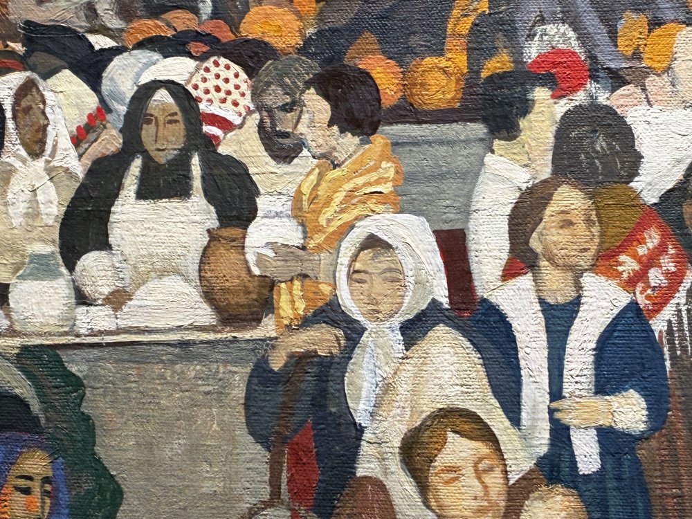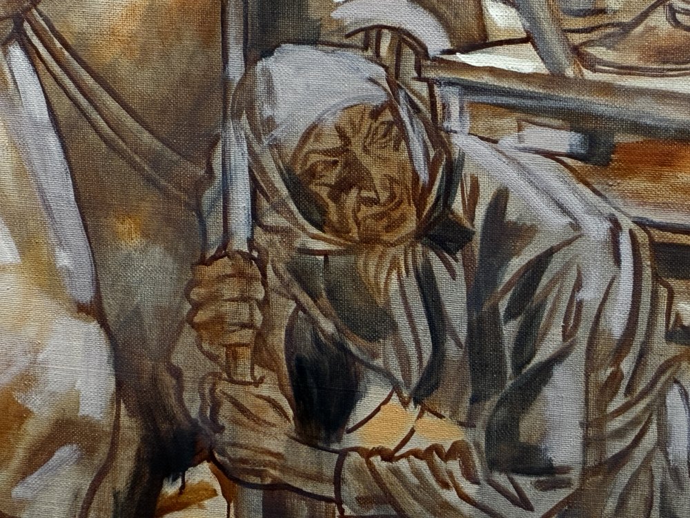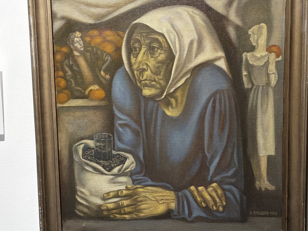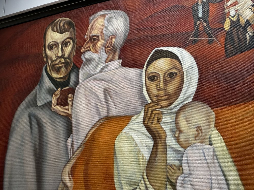 Центральное место на выставке занимает «картина, которой нет». Это огромный, метр восемьдесят на два с половиной, холст: «Митинг в деревне». Сюжет классический: годы Гражданской войны, в село входят красноармейцы, крестьяне слушают коммуниста-агитатора, но кое-то явно замышляет недоброе: кулак, купчина, злобная старуха…