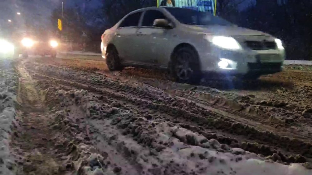 Однако даже на самых оживленных автомагистралях города сейчас есть проблемы с проходимостью: снег счищать не успевают, он превращается в кашу. Вот как, например, выглядит дорога на проспекте Победы: