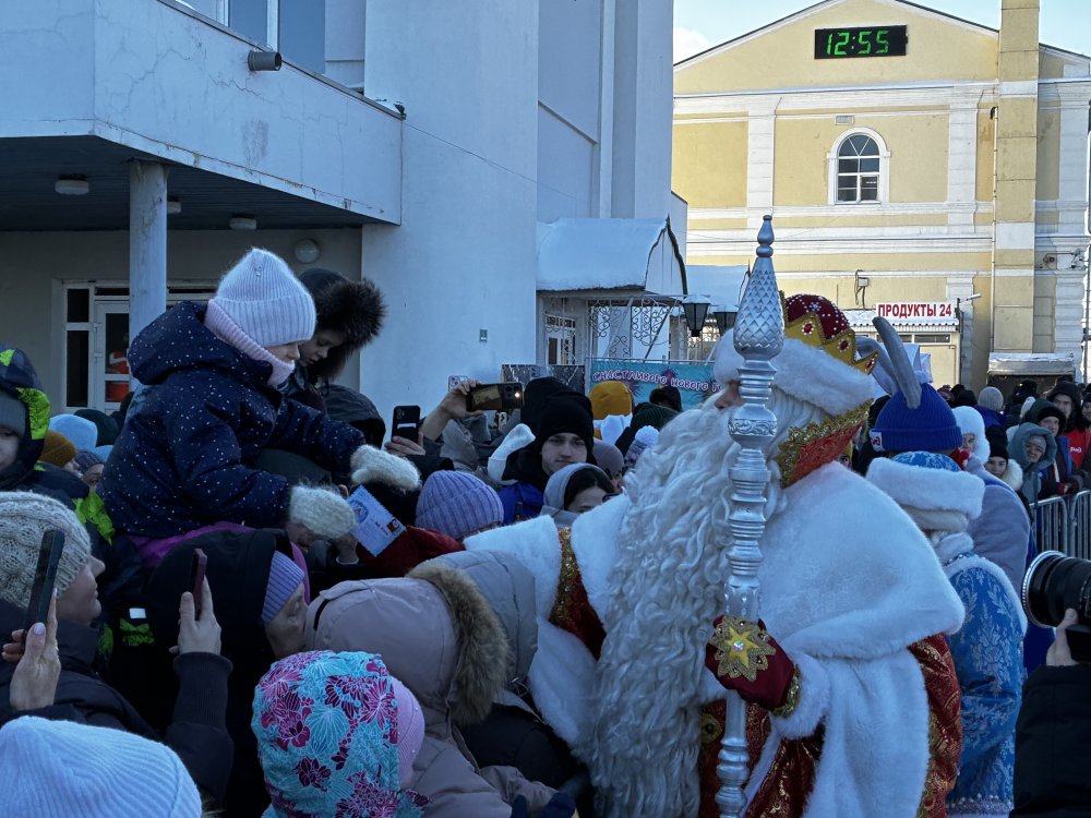 Дедушка здоровался с детишками, но они норовили всунуть в его руку очередной конверт. Дед подарки принимал и передавал их помощникам — на хранение. Фото 1743.ru