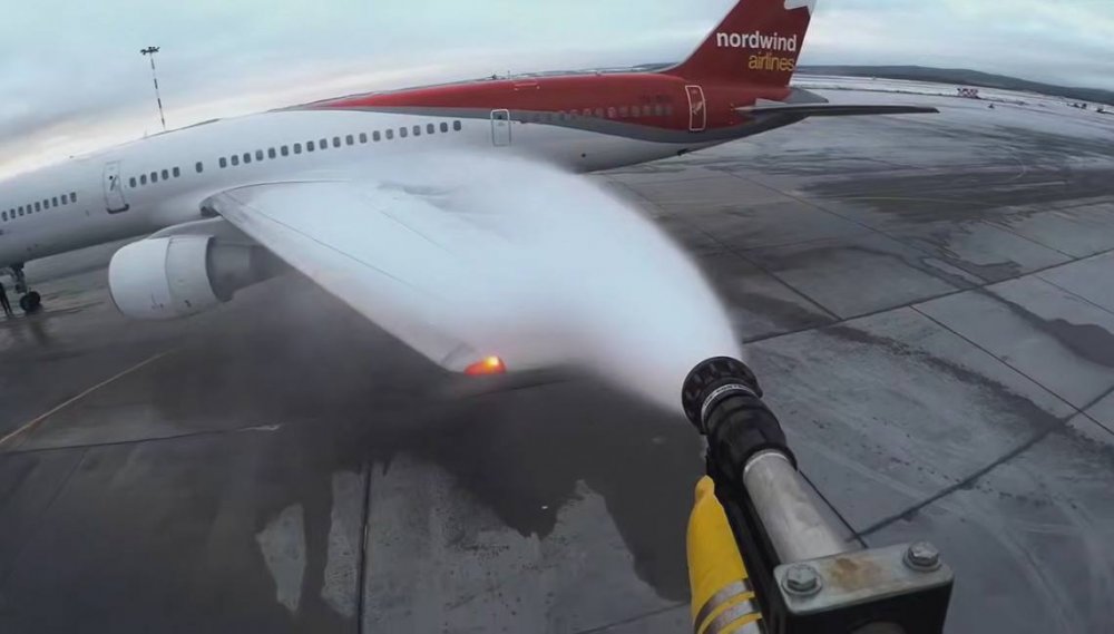 Ещё интересный факт: противооблединительная обработка проводится в два этапа, при этом используются два типа жидкостей — ТИП I и ТИП IV. Тип I смешивается с горячей водой и механически удаляет снежные образования на поверхности, температура этой жидкости — около 60 градусов. Но если осадки продолжаются, то обрабатывают еще и типом IV. Тут в составе есть этиленгликоль, смешанный с холодной водой. Он предотвращает появление обледенения на поверхностях самолёта до взлёта.
