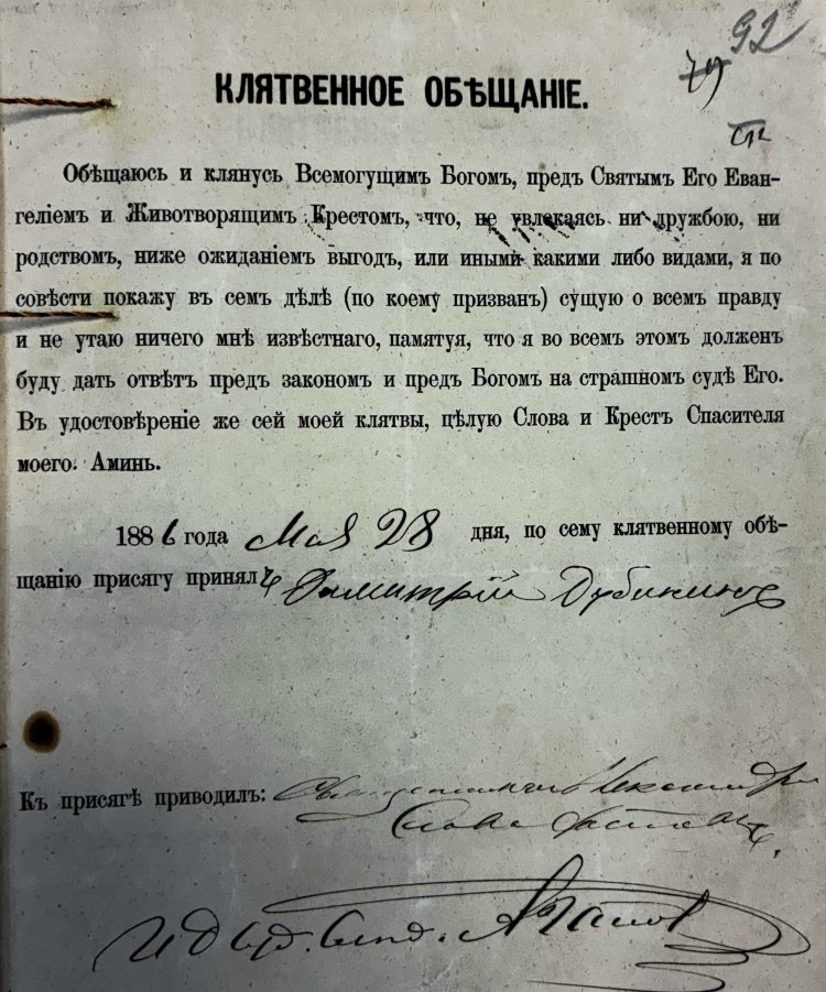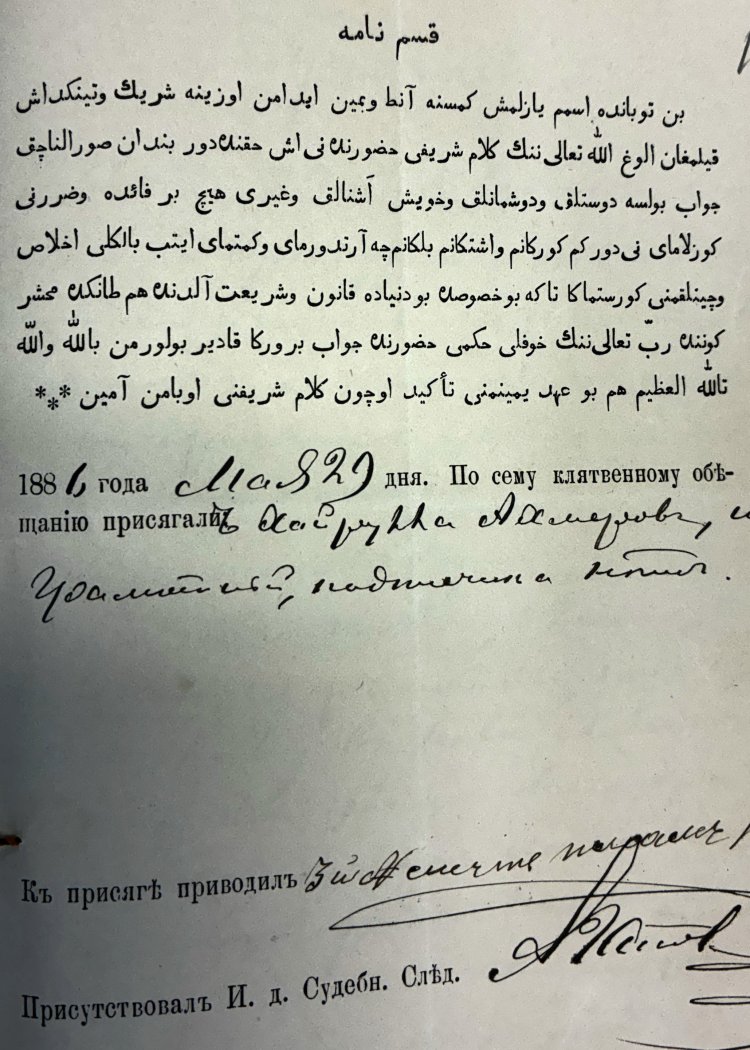 Свидетелей приводили к присяге: русских — православный священник, татар — мулла. Клятвенные обещания на русском и арабском языках аккуратно подшиты в дело