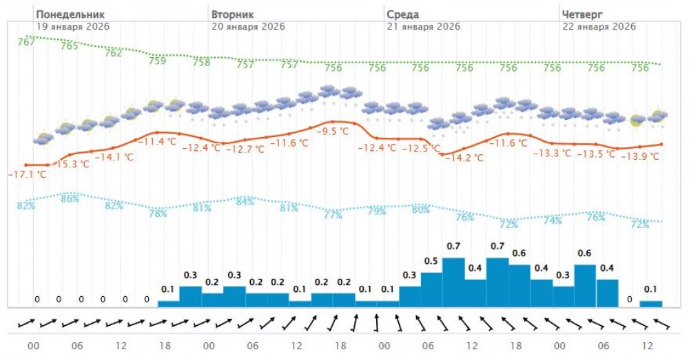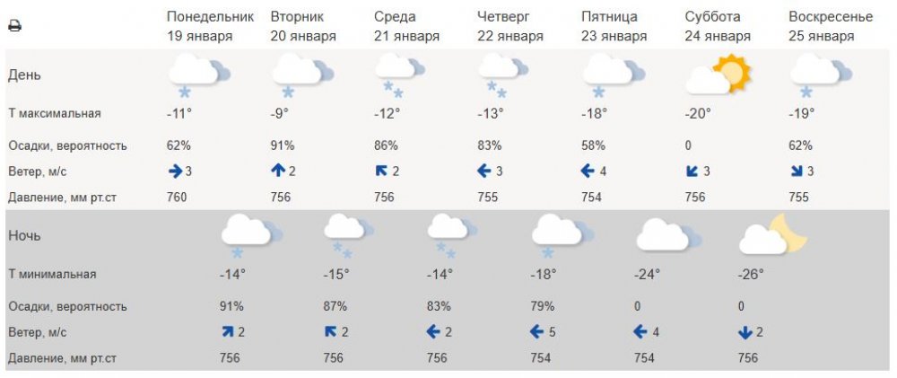 В целом погода будет достаточно ровной: умеренный мороз (от -9 до -18 градусов днем и от -14° С до -18° С ночью). Суббота, 24 января, ожидается ясной, но очень морозной: днем -24° С, ночью -26°С.