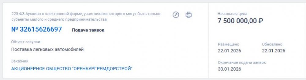 Акционерное общество «Оренбургремдорстрой», которое до недавнего времени, до приватизации, имело статус государственного унитарного предприятия (его учредителем было правительство Оренбургской области в лице Минприроды, и сейчас контрольный пакет акций принадлежит области) закупает новый автомобиль. На средство передвижения дорожники готовы потратить 7,5 млн рублей.