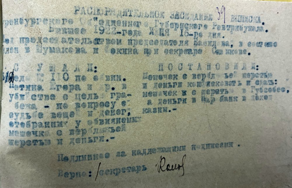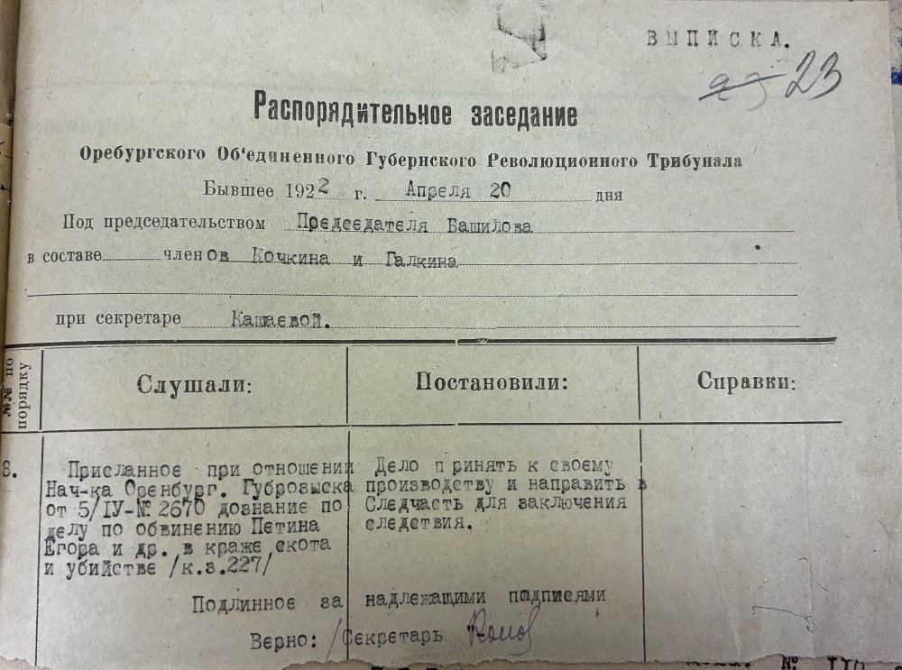 2 июня 1922 года военное отделение Оренбургского губернского революционного трибунала под председательством Галкина провело заседание по делу об убийстве, с момента которого прошло меньше трех месяцев (сроки судопроизводства тогда были, что и говорить, куда короче нынешних).