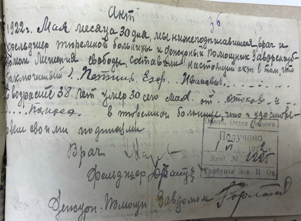 — Мы, нижеподписавшиеся врач и фельдшер тюремной больницы, и дежурный помощник заворенгубдомом лишения свободы, составили настоящий акт в том, что заключенный Петин Егор Иванович в возрасте 38 лет умер 30 сего мая от отеков и поноса в тюремной больнице, что и удостоверяем своими подписями.