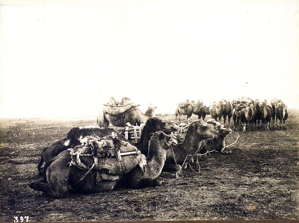 Верблюды в степи. Фото сделано этнографом Михаилом Круковским в 1909 году во время экспедиции в Оренбургскую губернию