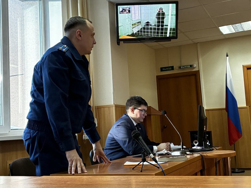 Руслан Абдуллин на экране телевизора в зале суда. Фото 1743.ru