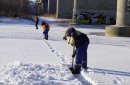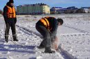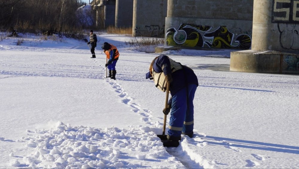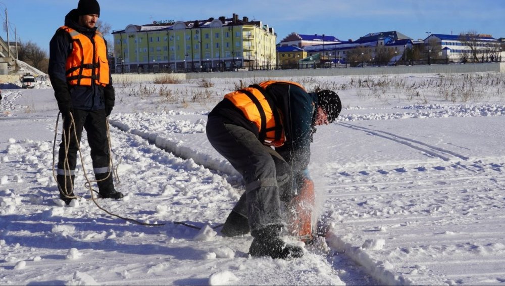 Сотрудники «БиОз» занимаются распилкой льда в Оренбурге; фото: пресс-служба администрации города Оренбурга