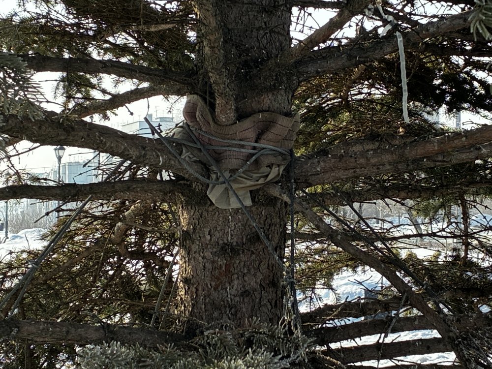 Как вы видите, зеленая и пушистая эта елка только внизу, у земли. Где-то от середины из ствола торчат засохшие ветки с редкой рыжей хвоей. Но именно эту лысую верхушку и видно из любого уголка сквера. В общем, с украшением что-то явно пошло не так.