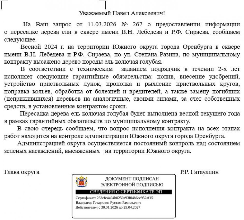 — Весной 2024 г. на территории Южного округа города Оренбурга в сквере имени В.Н. Лебедева и Р.Ф. Сираева, по ул. Степана Разина, по муниципальному контракту высажено дерево породы ель колючая голубая. В соответствии с техническим заданием подрядчик в течении 2-х лет исполняет следующие гарантийные обязательства... замену погибших (неприжившихся) деревьев на аналогичные, своими силами, за счет собственных средств, в установленные контрактом сроки. Пересадка дерева ель колючая голубая будет выполнена весной текущего года в рамках гарантийных обязательств по муниципальному контракту.