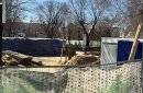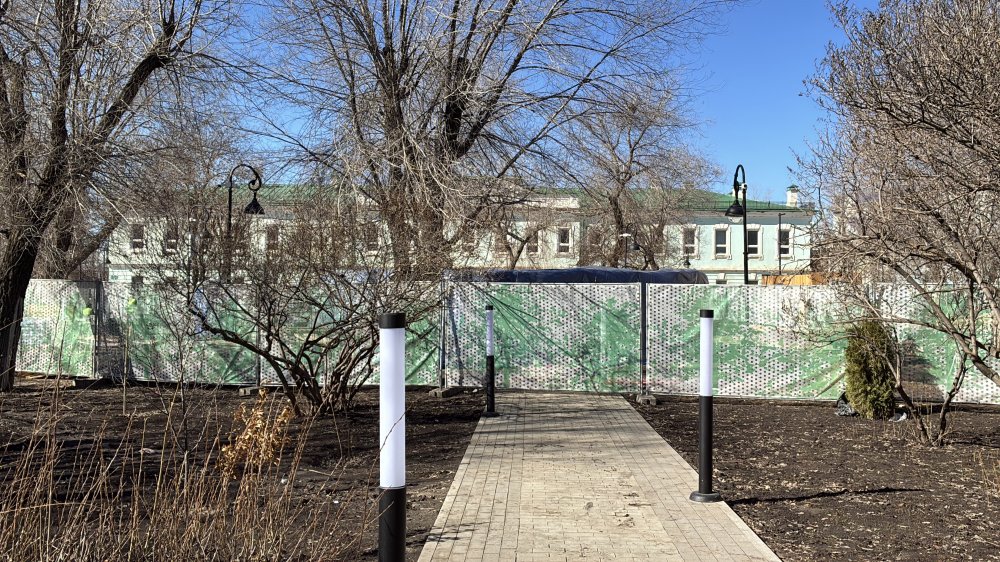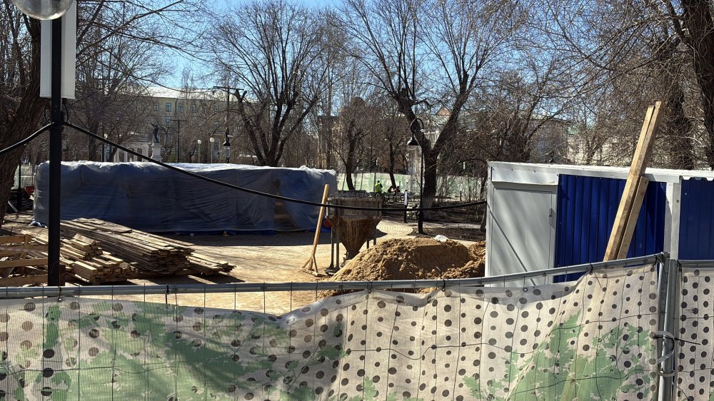 Территория вокруг него — это примерно треть всего сквера — обнесена забором. Видно, что за ним лежат кучи песка, штабеля досок, в отдельном закутке — гора строительного мусора. Сама чаша бассейна накрыта, на каком этапе работы находятся сейчас, не понятно. Но очевидно, что до их завершения еще далеко. При этом на огороженной территории суетятся рабочие, слышно, как визжит болгарка — то есть дело не застыло на месте.