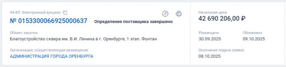 В изначальной версии контракта было прописано, что все работы — в том числе устройство самой чаши фонтана вместе с системами подачи воды и водоотведения, облицовка гранитными плитами, установка 44 светильников и т.д. — все нужно было завершить к 30 октября. Потом сроки пересмотрели и заменили на более реалистичные: до 30 ноября. Но все равно не успели, работы продолжаются по сей день, а закупка, которая должна была давно завершиться, зависла в стадии «определение поставщика завершено».
