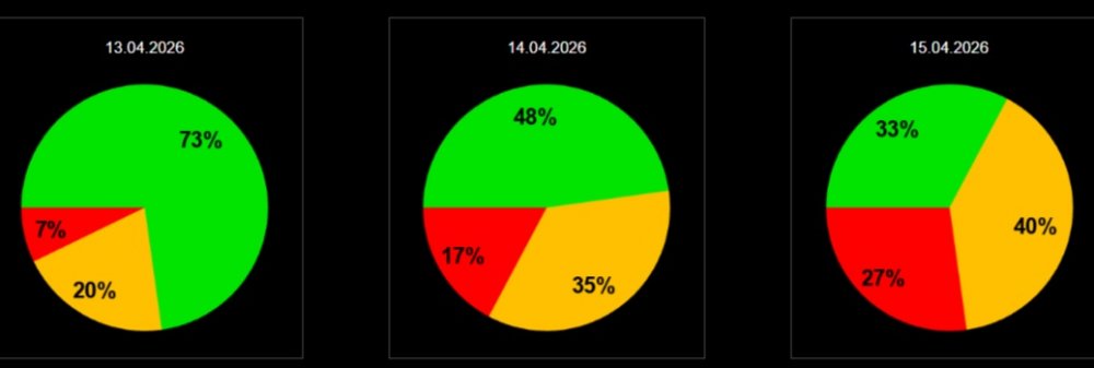 13 апреля день обещает быть относительно спокойным. Геомагнитная обстановка на Земле не предвещает каких-либо значительных потрясений. КР-индекс, который почти с самого утра будет находиться на отметке в 3 балла, к 18 часам снизится до 1 балла и, вероятно, останется в этом положении на протяжении следующих суток. Вероятность магнитной бури в этот день оценивается в 20% для слабой мощности и лишь 7% для геомощной бури, оставляя 73% на полную геомагнитную тишину.