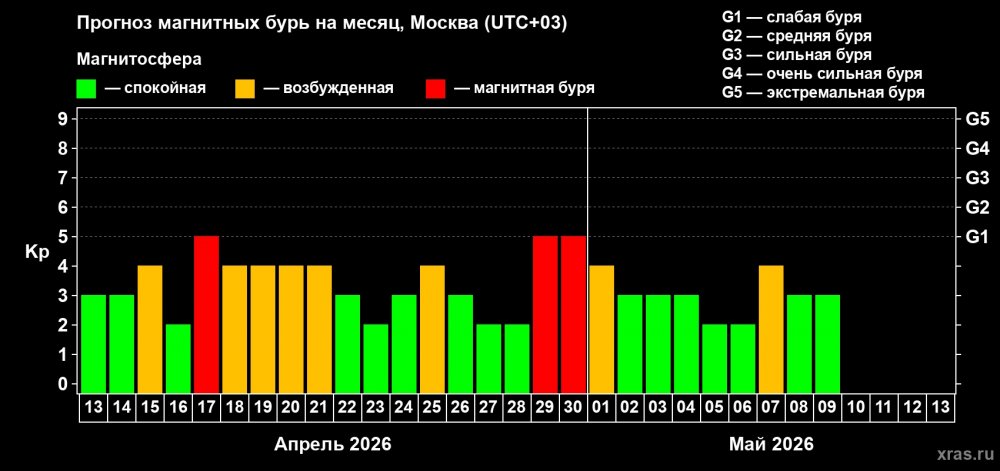 Долгосрочный прогноз магнитных бурь на апрель 2026 года