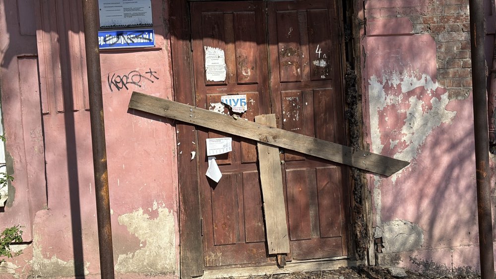Относительно недавно в этом здании жили люди, их расселили из-за аварийности дома, и сразу после этого (как обычно и бывает) он стал ветшать с огромной скоростью. Во время проверки выяснилось, что там отсутствуют некоторые оконные проемы, а внутри живет бомж. Между тем, это объект культурного наследия, и сохранять его городская администрация обязана.