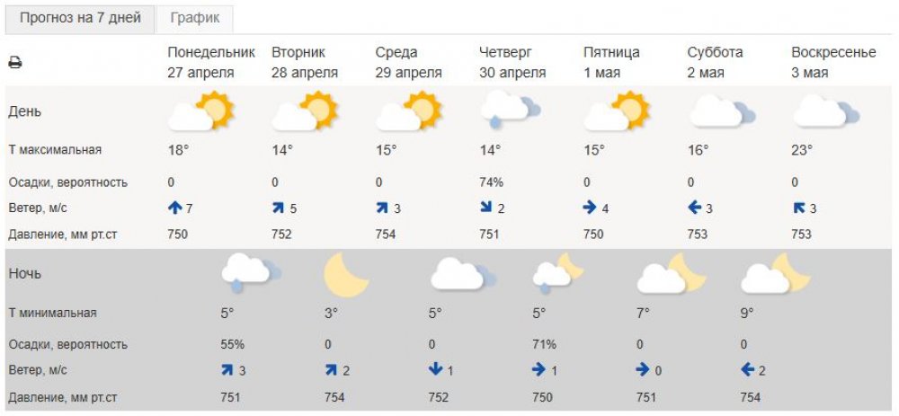 Судя по краткосрочному (а значит, наиболее точному) прогнозу Росгидрометцентра, всю эту неделю будет холодно: днем от +14 до +16°С, ночью от +3 до +7°С. Солнце будет выглядывать редко, но обильных осадков не ожидается. И только в воскресенье, 3 мая, температура существенно повысится: ученые прогнозируют +23°С.